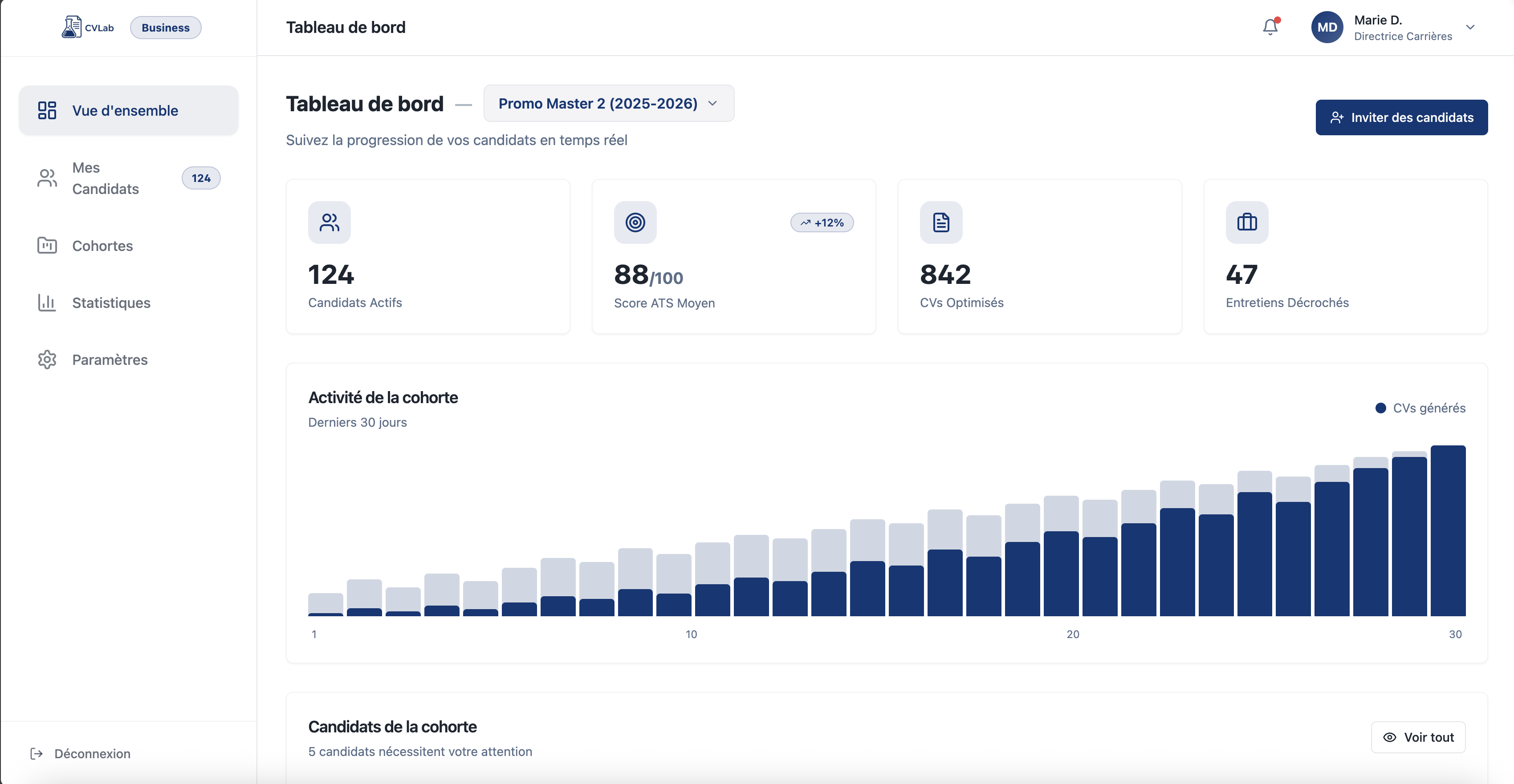 Suivez l'activité de vos étudiants par cohorte, identifiez les tendances et optimisez votre accompagnement.